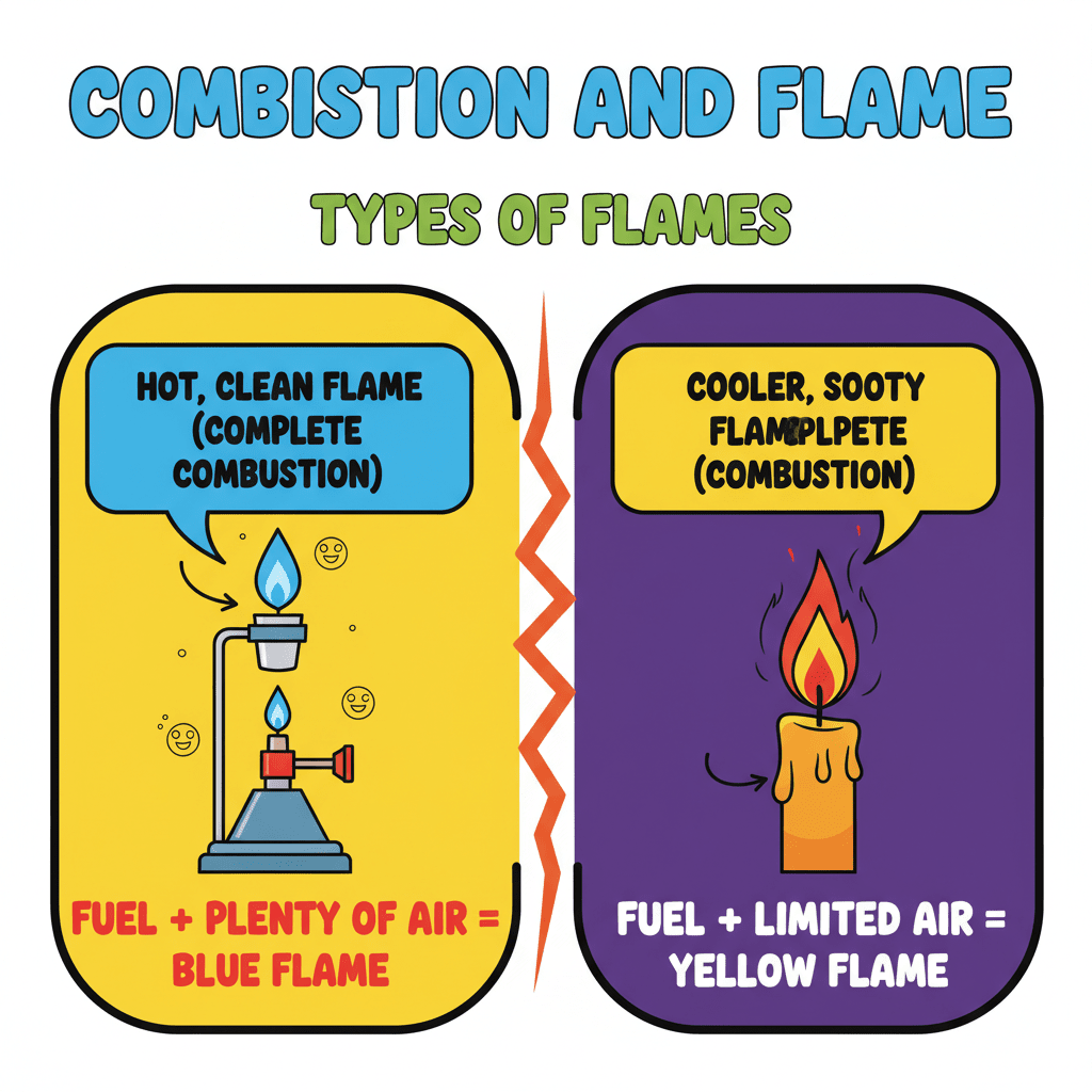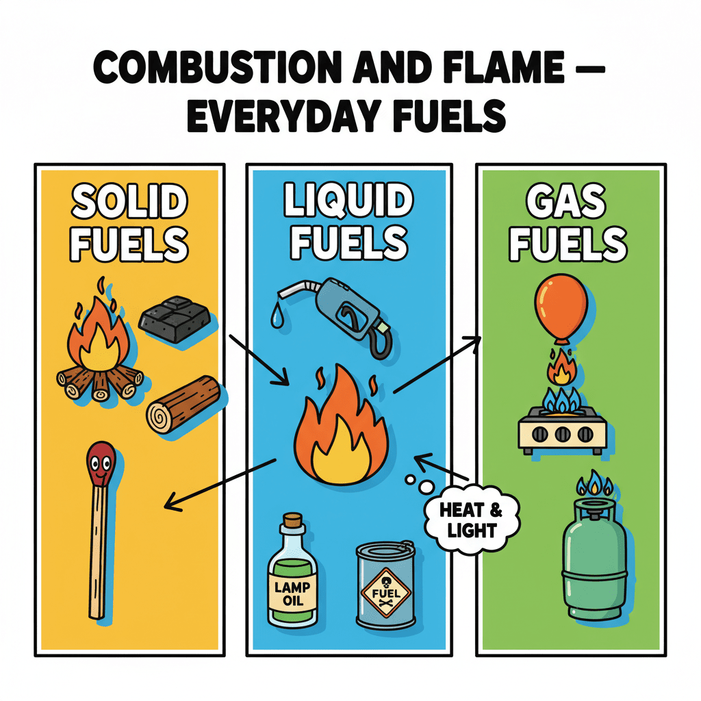 Alright everyone, let's dive into the fascinating world of combustion and flame! Think about all the different kinds of fuels we use every day—at home for cooking, in factories to power machines, and in our cars to get us from place to place. What are some examples that come to mind? Maybe wood, petrol, or even CNG?