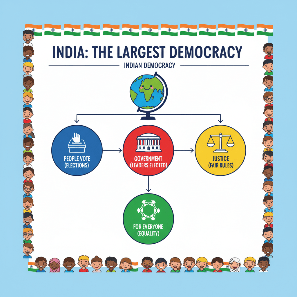 India is the world's largest democracy! Core principles such as Justice, Liberty, Equality, and Fraternity are very important to our democracy. Justice ensures everyone is treated fairly, regardless of gender, race, or religion. Liberty gives us freedom of thought, speech, and expression. Equality means every person is considered equal, and Fraternity encourages us to maintain unity despite our diversity. Our Constitution declares India as a democratic, secular, and socialist country, with the Preamble setting out these core beliefs.