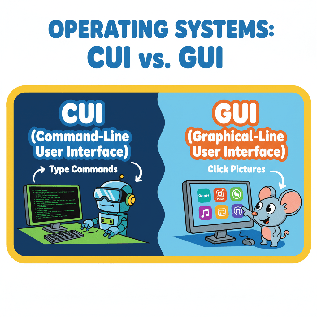 Operating systems come in two main types: Character User Interface (CUI) and Graphical User Interface (GUI). CUI operating systems rely on typing commands—think of older systems like DOS or Linux. GUI operating systems are more visual, using icons and images that you can click on with a mouse, like Windows or macOS.