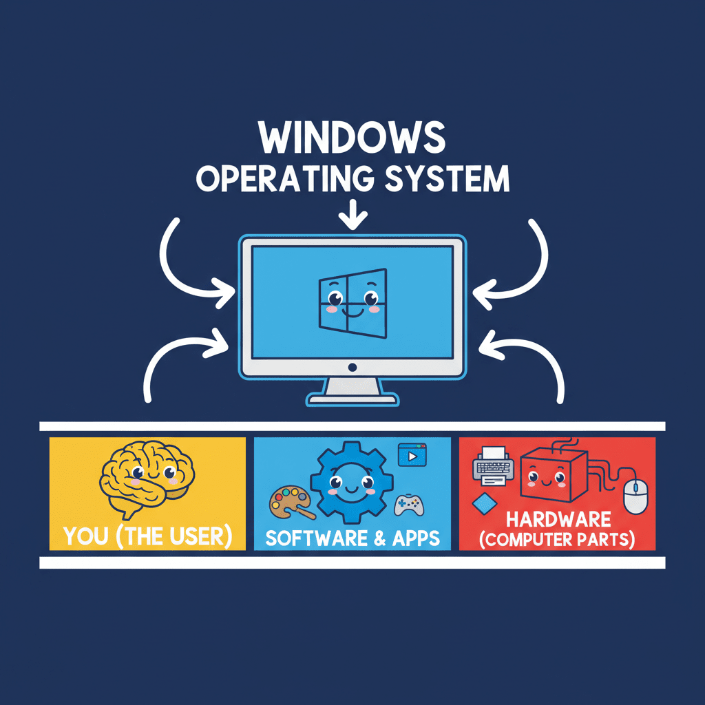 Alright class, let's dive into operating systems! Think of the operating system as the conductor of an orchestra. It's the special software that starts up automatically when you turn on your computer. It's absolutely essential because without it, your computer is basically useless. It allows you to interact with programs and manages all of the computer's resources.
